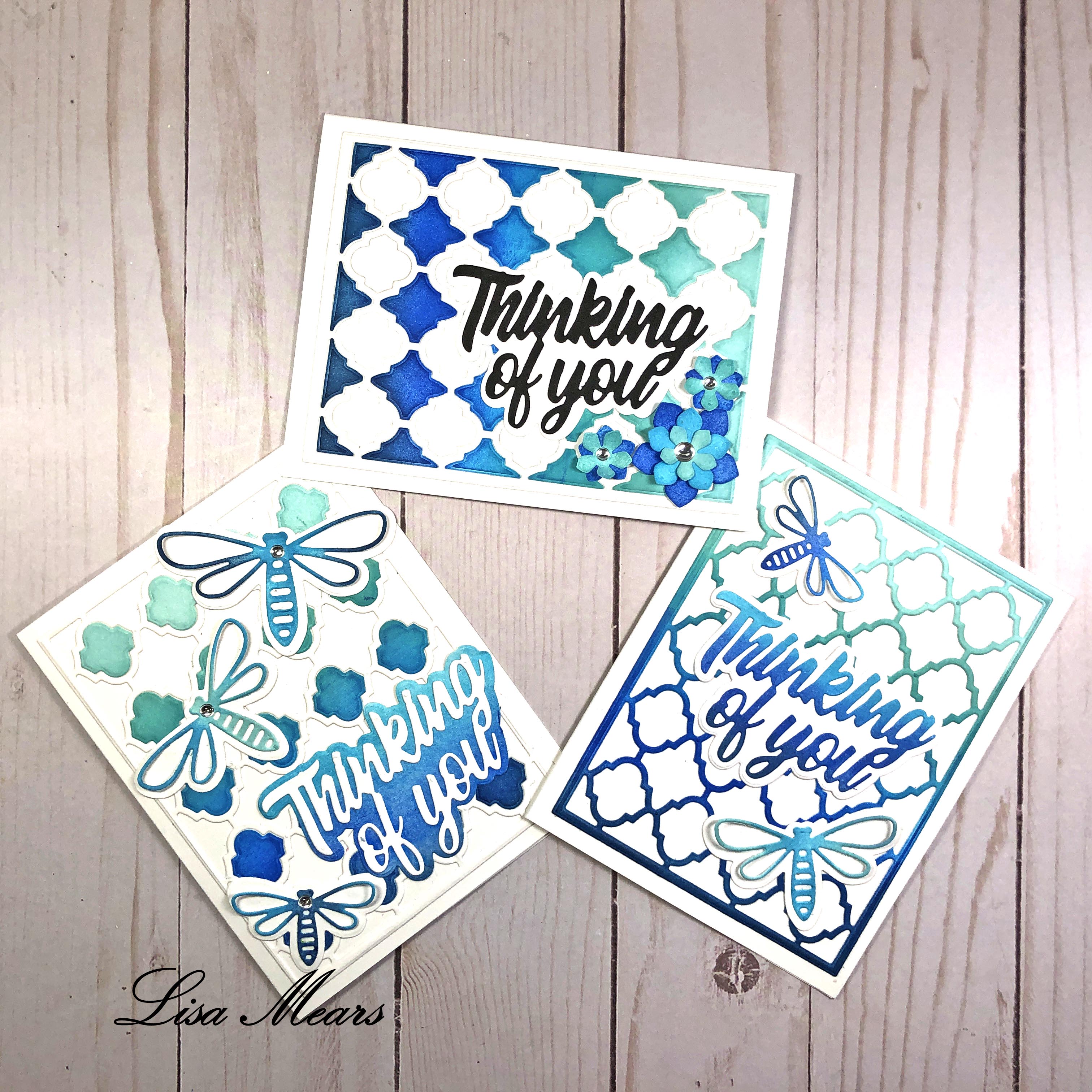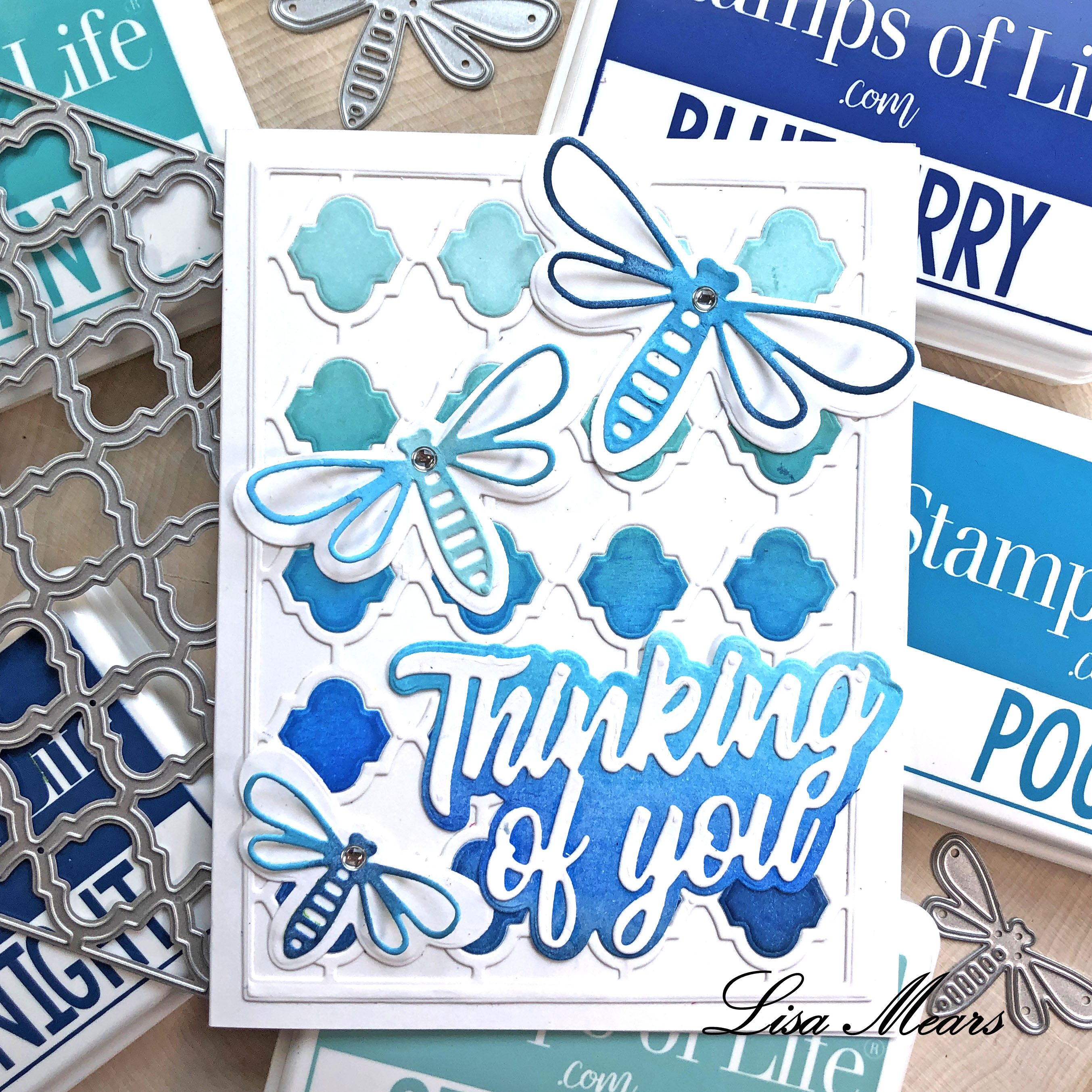 Today I’m sharing three cards that I made using one ink-blended background. I used the background die from The Stamps of Life’s Dragonfly and Flowers A2 Card Set. This set comes with the background die, a Thinking of You word die, three dragonflies with shadows, three flowers with shadows, and three smaller flowers. It also comes with a die to make an A2 size card.