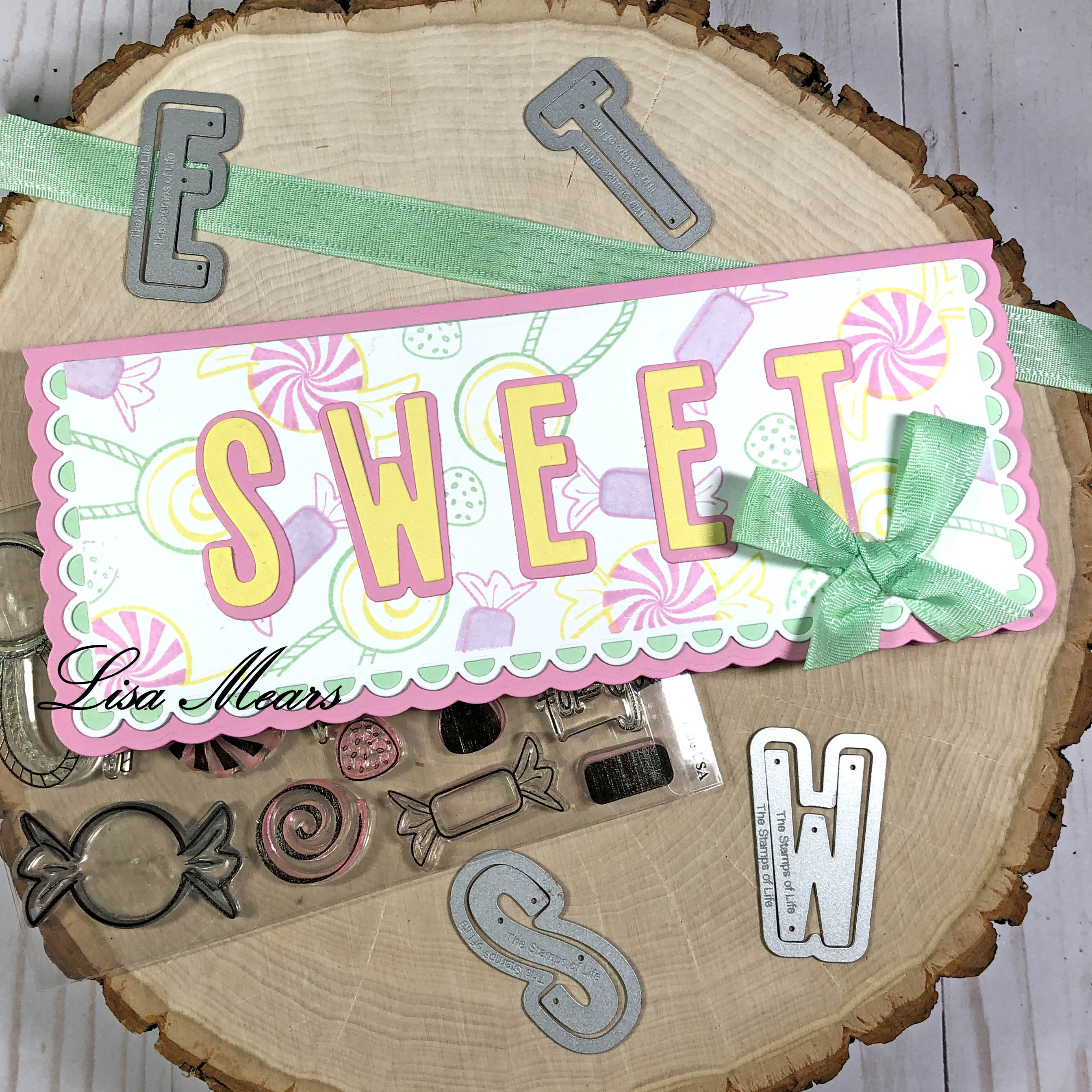 Today on my blog I’m sharing a slimline card that I made using several fun products from The Stamps of Life. I used the brand new Solid Alphabet die set for the letters on this card. I created my own pattern paper using the Candy2Share stamp set. The card base is the Scalloped Slimline die set. See below for a full supply list and video tutorial.