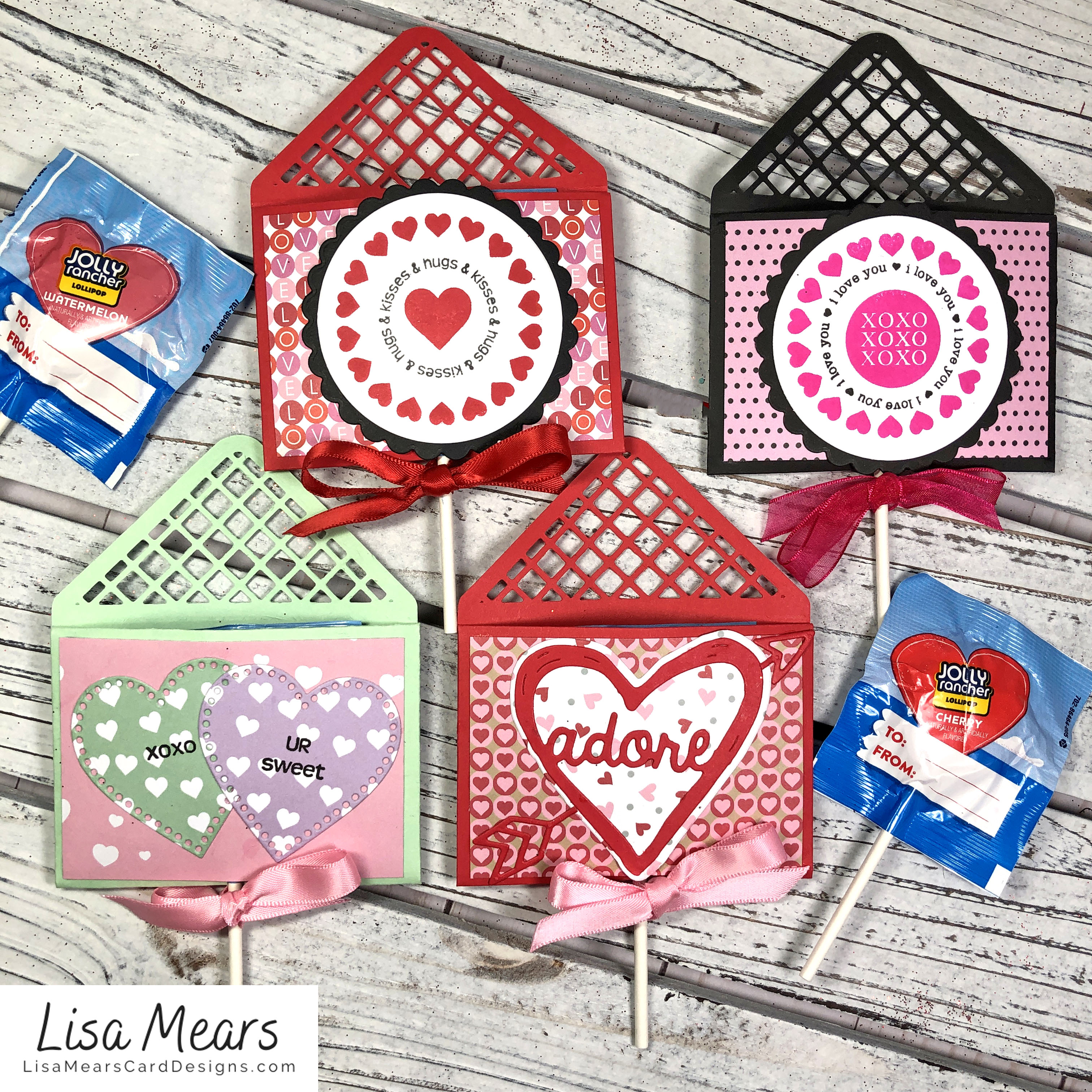 Hello. Today I’m sharing a Valentine’s Day lollipop holder. I created the lollipop holders using the Lattice Gift Card Holder die set from The Stamps of Life. This die set makes a holder for a gift card, but I modified it slightly so that it will hold a lollipop. The lollipops I used are the Jolly Rancher lollipops. You can decorate them with any of your stamps and dies. A complete tutorial is on my YouTube channel.