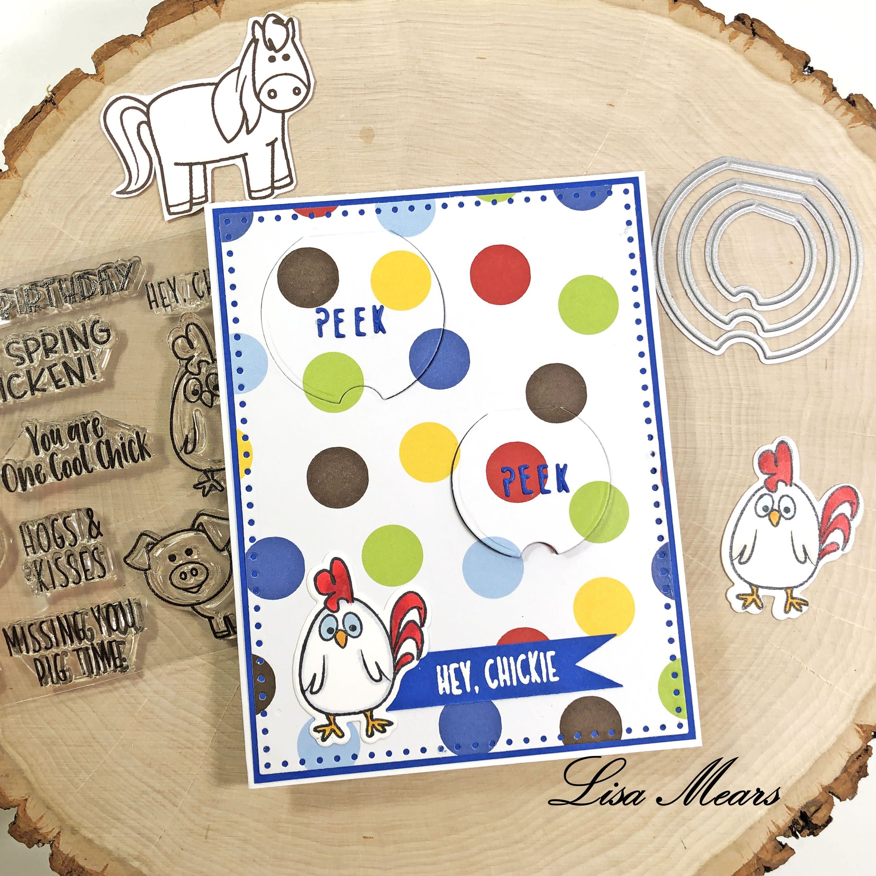 Today on my blog I’m sharing a fun card that I made using the peekaboo round die set from The Stamps of Life. This die set consists of a set of circles in various sizes that you can use for windows on your card. When you open the window, you can have a fun stamped image underneath. I used the FarmAnimals2Stamp set under the circles and included a sentiment as well.