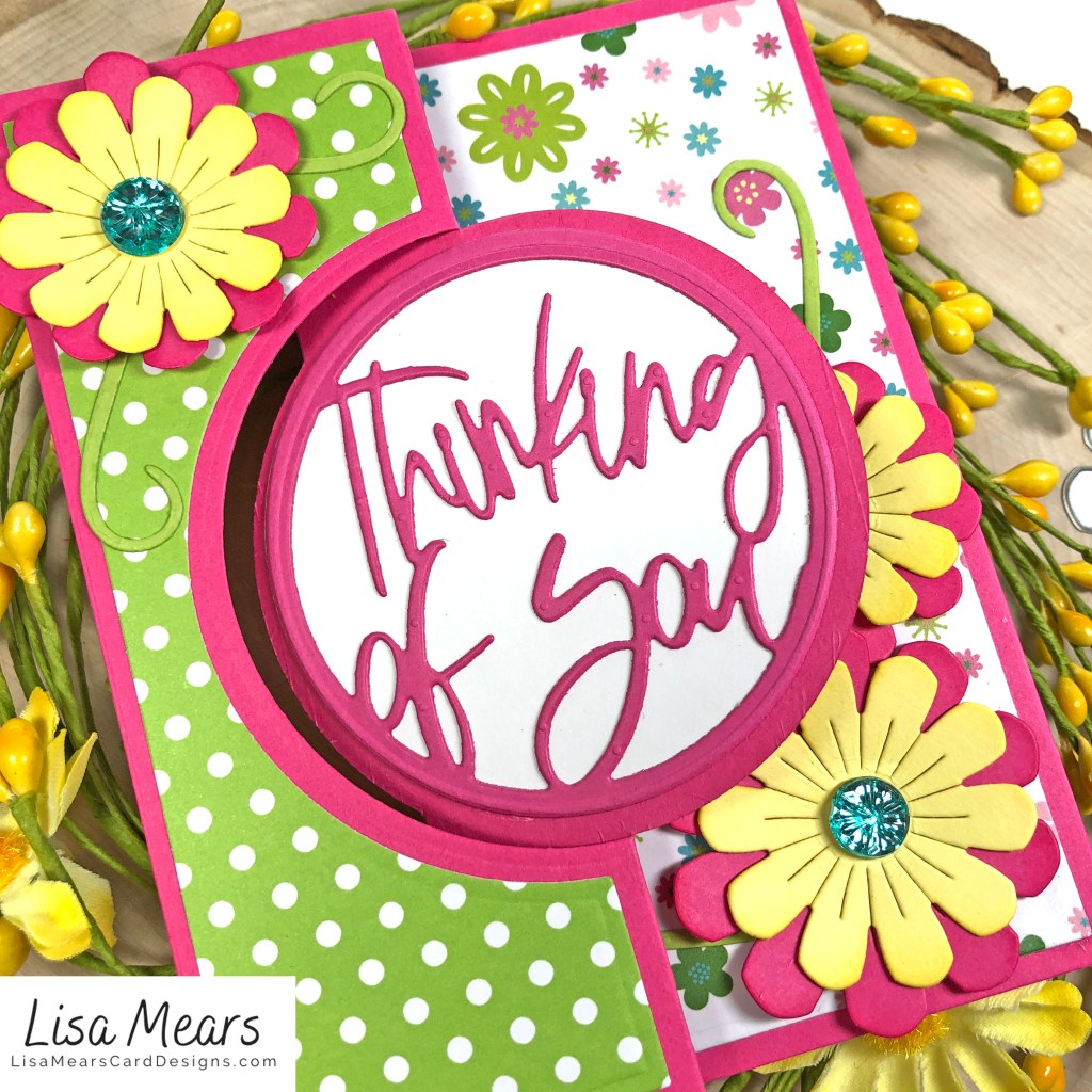 In my first card, I used the Large Circle Flip-it to create this Thinking of You card. I just love the flowers included in the circle flip-it card base. I layered them up and inked the edges to give them some dimension. The Thinking of You die in the center of the flip-it card is part of an add-on set of dies. The add-on set consists of other words such as Just Pray, I’m So Sorry, and Thank You My Friend.