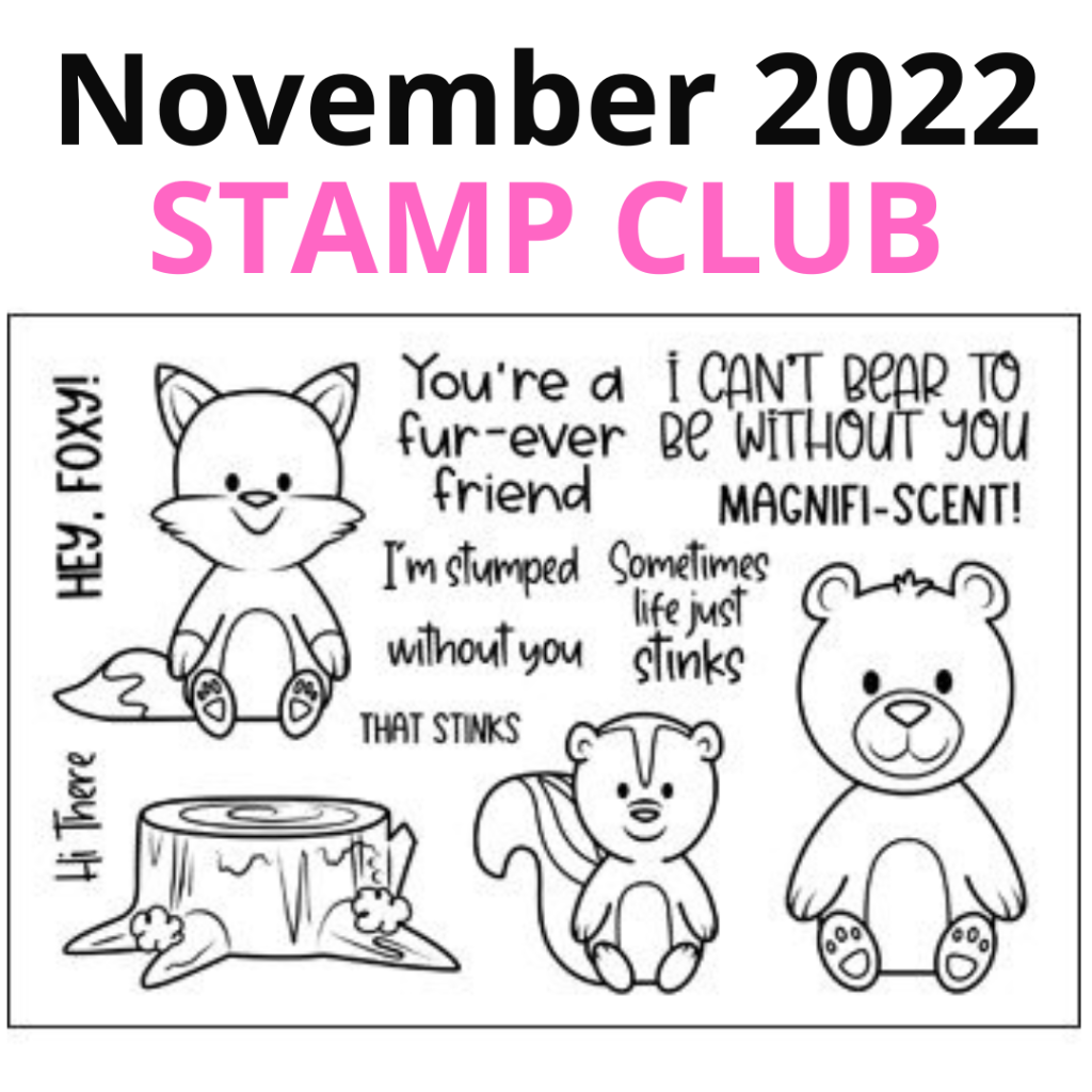 The Stamp Club and Die Hard Club sets feature three woodland animals — a fox, skunk, and a bear. It has a tree stump for the animals to sit on and several sentiments.