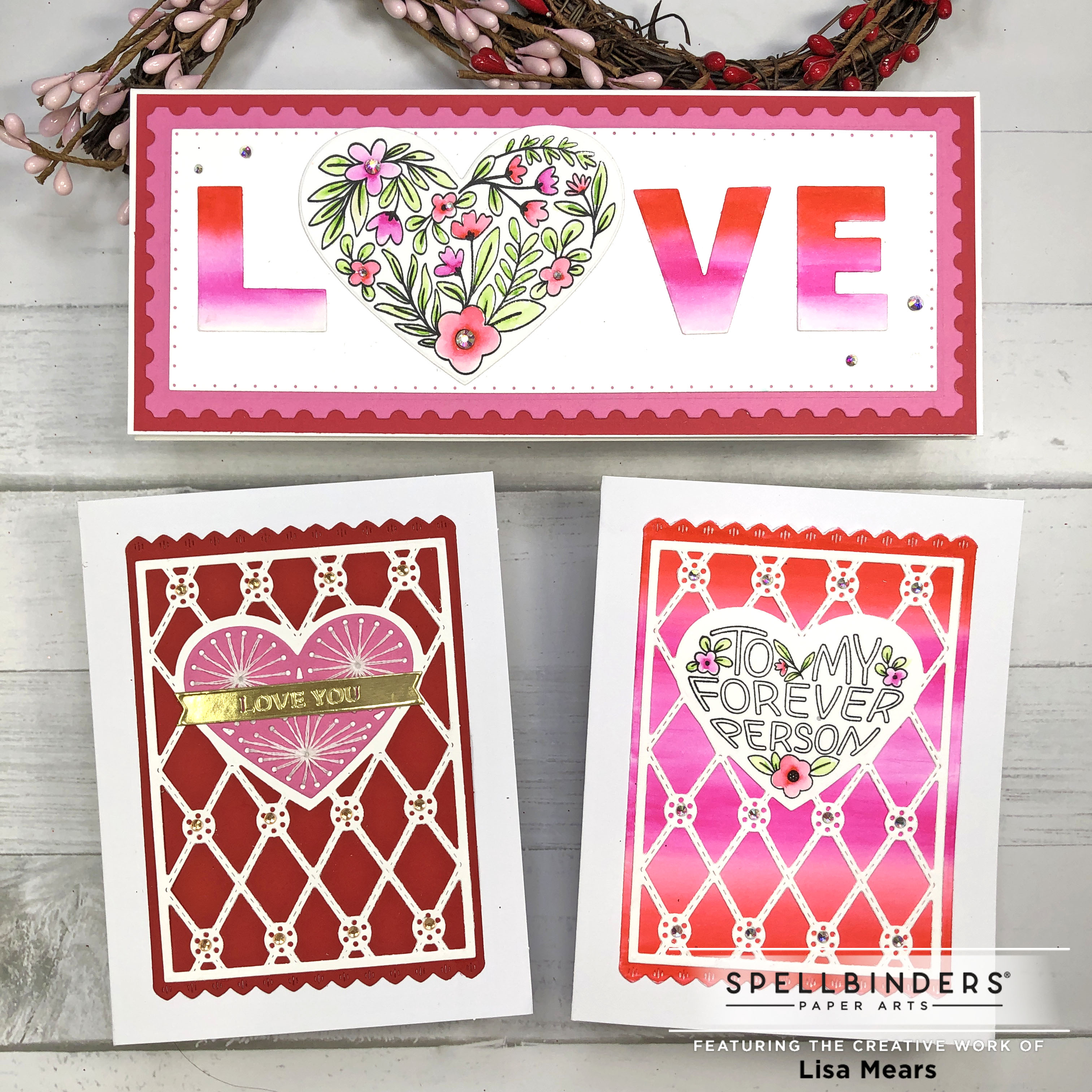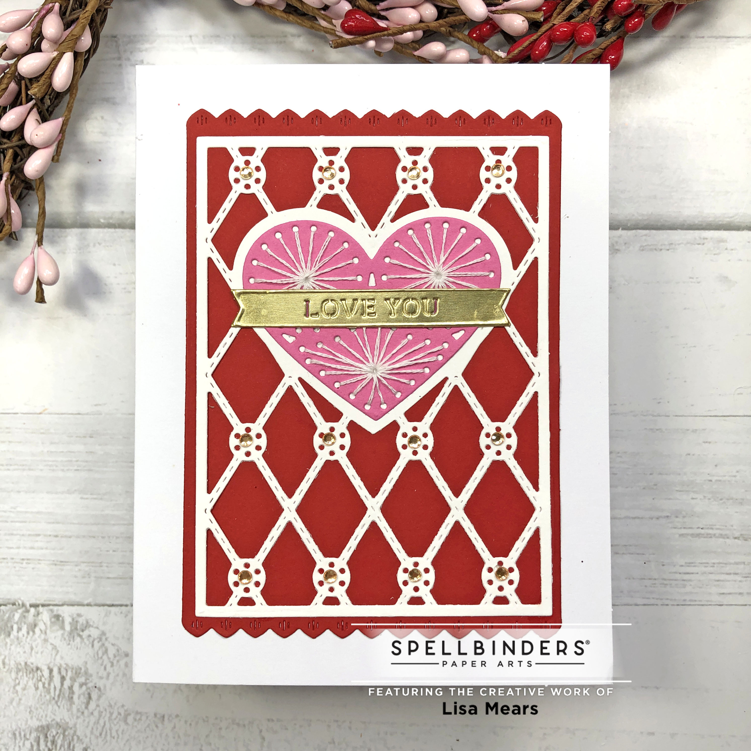 If you don’t like creating your own watercolor backgrounds, you can always use solid cardstock for the background like I did with the card below. I also die cut the large center heart from pink cardstock and used embroidery floss to add stitching to the heart. I added the banner sentiment from Gold Mirror Cardstock and added the Spellbinders Spectrum AB Color Essential Gems to the circles.