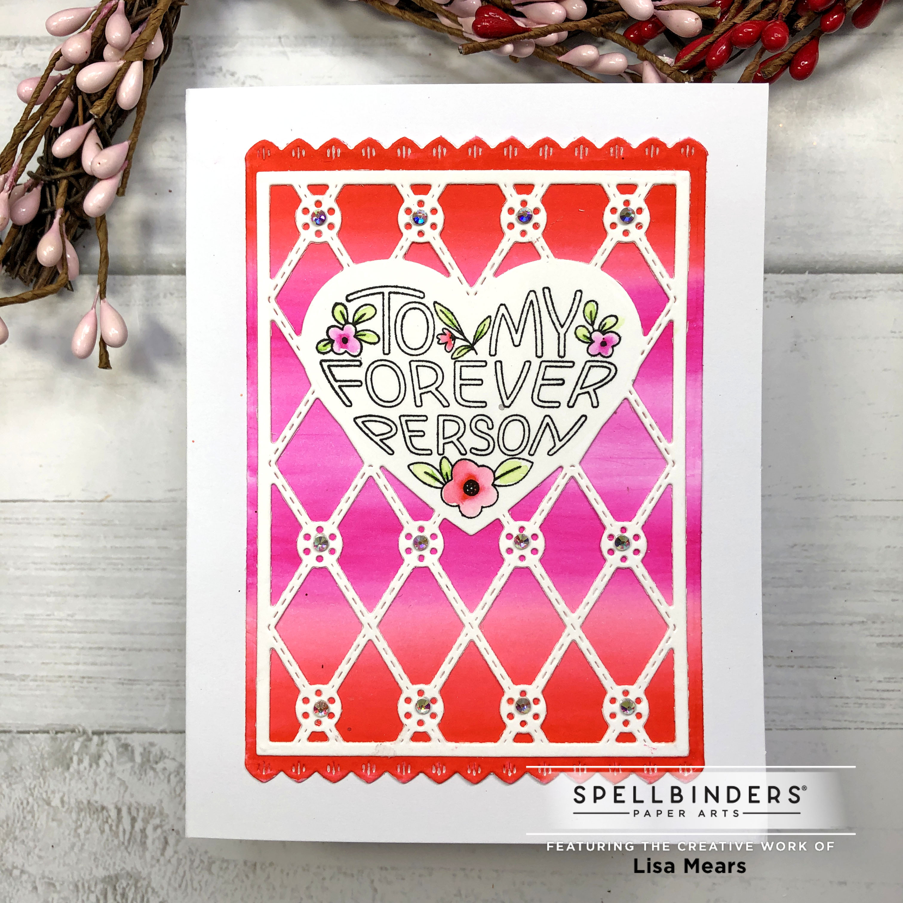 For my first card, I used the Spellbinders Clear Stamp and Die Club of the Month called My Forever Person. I stamped the floral heart and colored it with Zig Clean Color Real Brush pens. I die cut it with the coordinating dies. I also used the dies to die cut the letters from Bristol Smooth Cardstock. I colored the die cut letters with Zig Clean Color Real Brush pens and blended the colors with a water brush to create a gradient of color. I used the Spellbinders Slimline Postage Edge dies for the layers of my card. Finally, I added the Spellbinders Crystal Mix Color Essential Gems to the center of the flowers and on the card front.