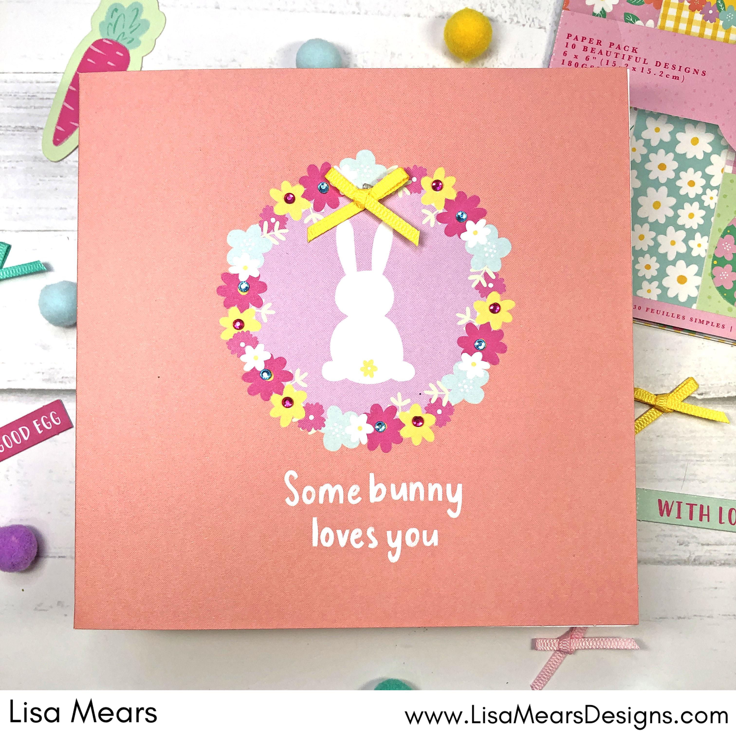 For this card, I used the 6 x 6 card base from the Hoppy Easter card kit. I added adhesive gems to the flowers and added a bow to the top of the wreath.