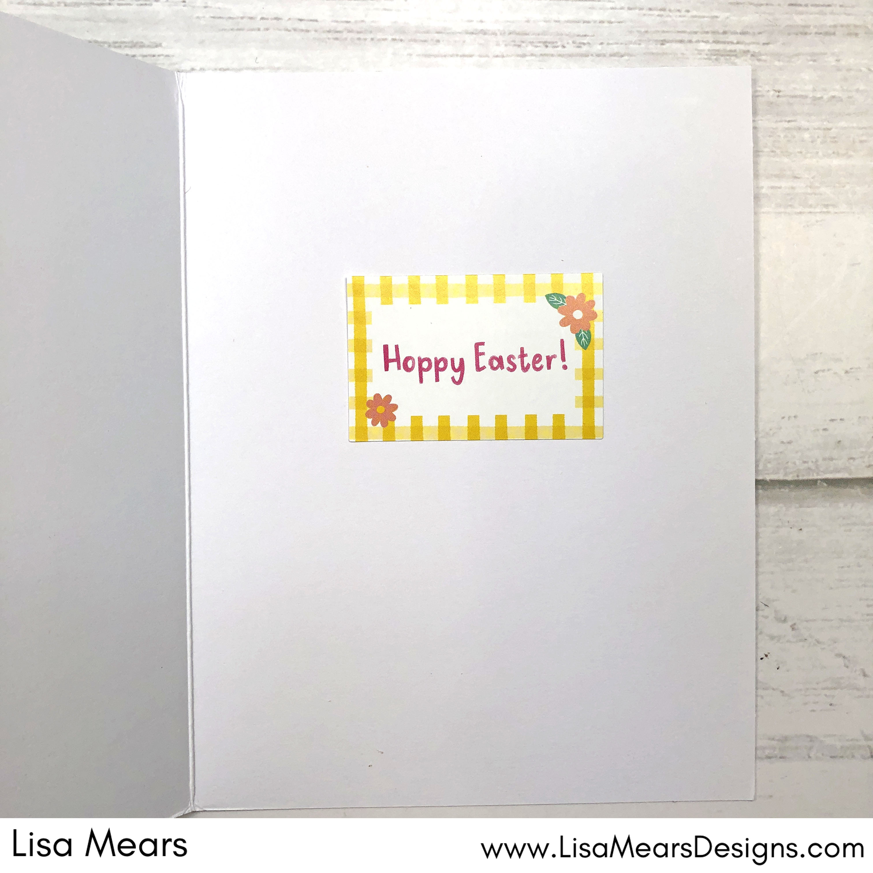For this card, I used the 6 x 6 card base from the Hoppy Easter card kit. I fussy cut the Easter eggs from the 12 x 12 Hoppy Easter pattern paper pad. I die cut the yellow/white pattern paper from the 12 x 12 paper pad using a Waffle Flower scalloped square die.