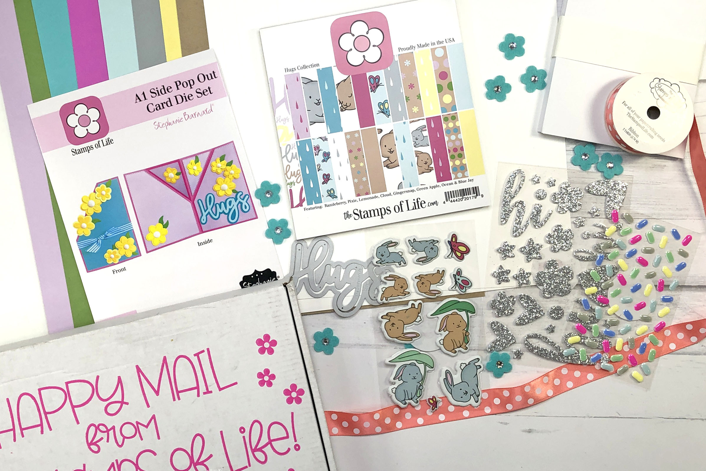The kit includes 12 pieces of cardstock, A2 envelopes, plastic storage envelope, paper pad, Hugs word die, epoxy stickers that are sprinkles, bunny puffy stickers, silver glitter puffy stickers, felt flowers, ribbon, and an A1 Side Pop Out Card Die Set.