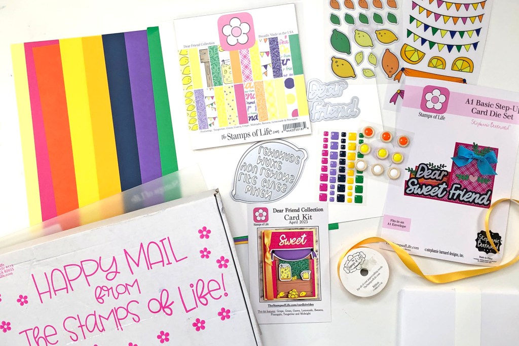 The kit includes 12 pieces of cardstock, A2 envelopes, plastic storage envelope, paper pad, Dear Friend word die, two sheets of stickers, embellishments, epoxy squares, yellow ribbon, and an A1 Basic Step-up Card Die Set. This month, there are two freebies included in the card kit, but you’ll have to watch my video to see what those freebies are.