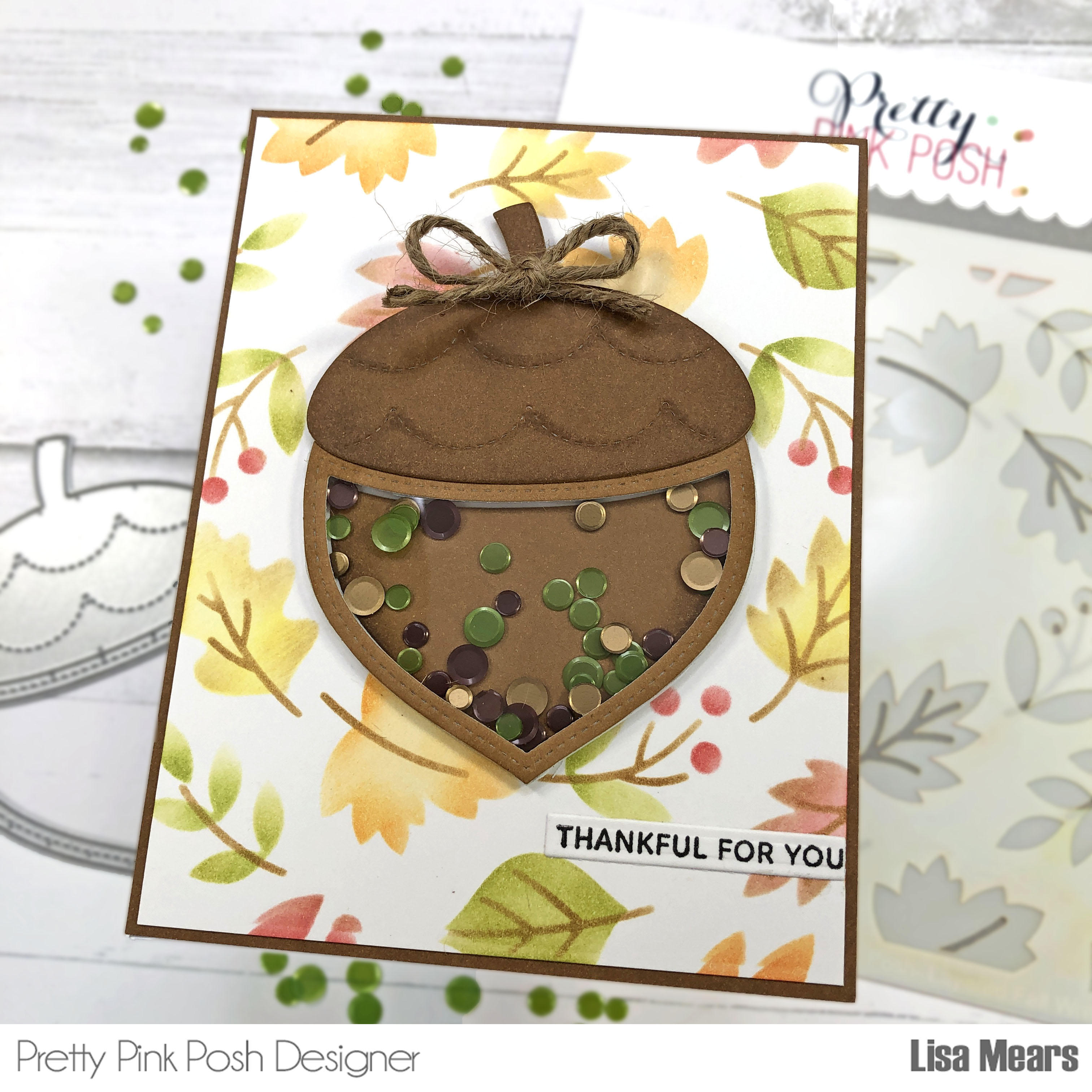 Today I’m sharing a fall shaker card that I made using some of the brand new Fall products from Pretty Pink Posh. Two of the main products I used on my card are the Acorn Shaker die and the Layered Fall Wreath Stencil.