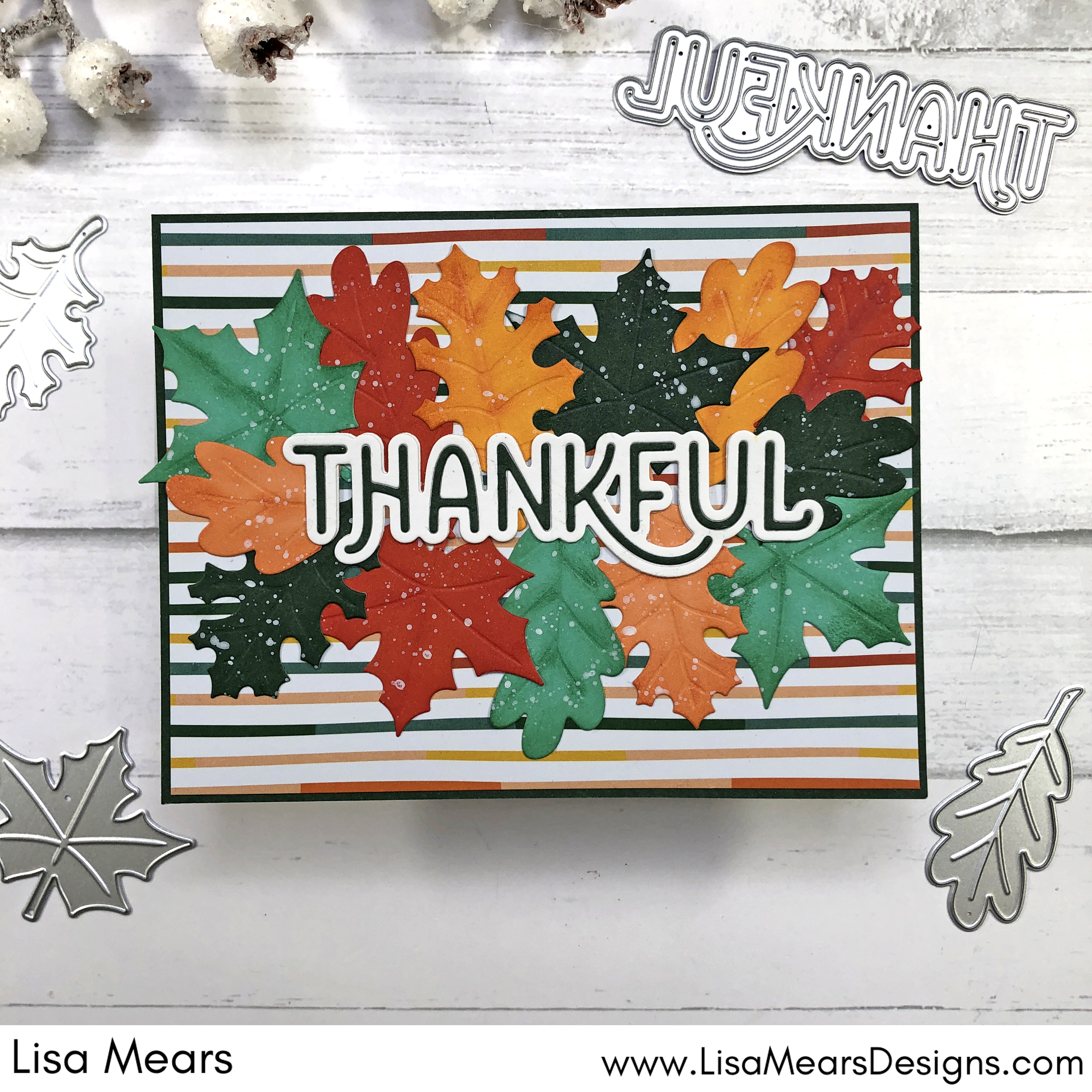For this card, I die cut the fall leaves from the Cozy Foliage dies in several different colors of solid cardstock from the Joyful Smooth Cardstock paper pad. I inked the edges and splattered some white acrylic paint on the top. I added the leaves in a circular pattern around the center of the card panel and added the sentiment from the Grateful, Thankful, Blessed Sentiments to the top.