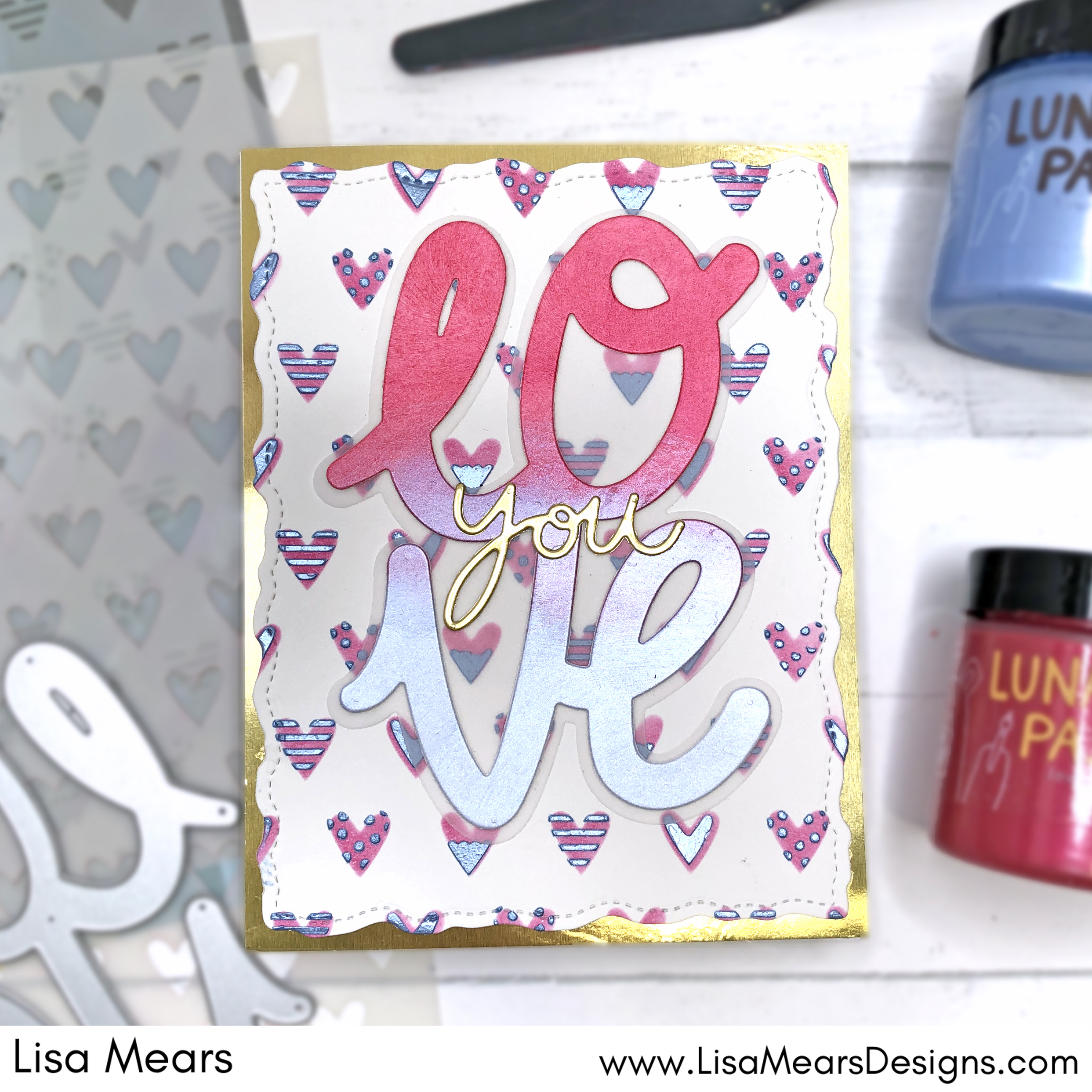 The next technique is to add Lunar Paste with an ink blending tool to a piece of cardstock and smooth it on like ink. You can make some really nice backgrounds doing this. One dry, you can die cut the cardstock with any die. For my card, I used the Scrapbook.com Love You dies. I love how big these letters are. Look at all of that beautiful metallic shine with the ombre effect….Gorgeous!