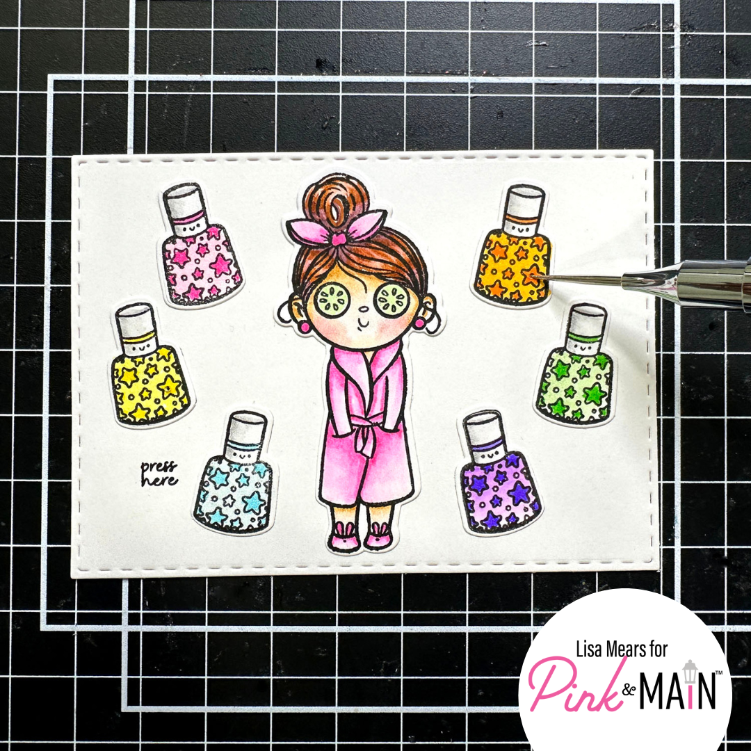 To add more sparkle, I used the Pear Blossom Press Twinkle Lights behind three of the nail polish bottles. I used my piercing tool to poke a hole inside three of the stars.