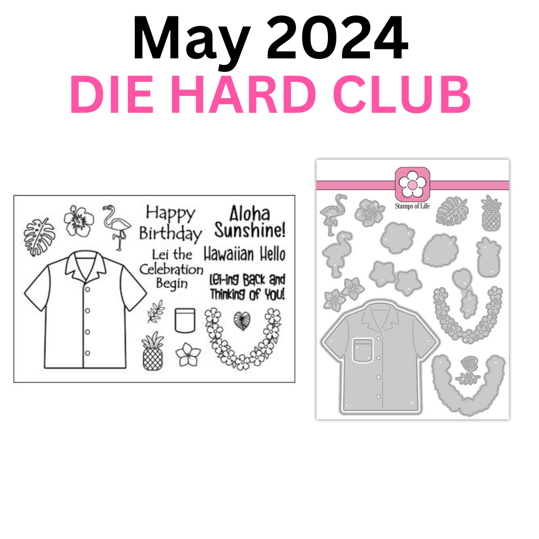 The Stamp Club and Die Hard Club set for May 2024 is called Tropical Vibes. The set comes with a shirt stamp with several smaller icon stamps including a tropical leaf, hibiscus, flamingo, and pineapple that can be stamped on the shirt to make a fun tropical shirt. There is also a lei that can be added to the shirt and five sentiment stamps.