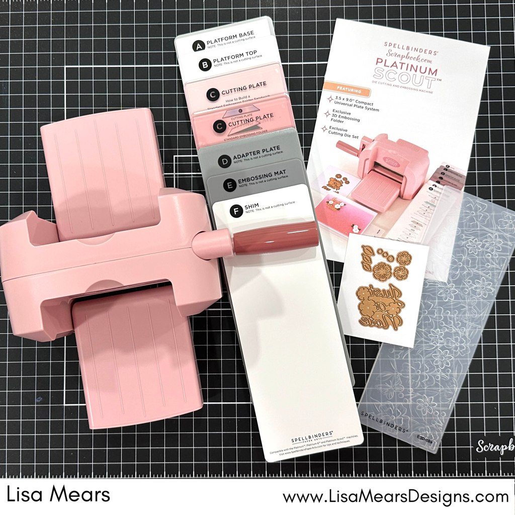 I’m beyond thrilled to share the brand NEW Spellbinders Scrapbook.com Platinum Scout. The Scout is a mini version of the Spellbinders Platinum 8.5-inch and 6-inch machines. It is very compact in size, but is definitely a workhorse like the bigger machines. The beautiful Rose Quartz color is exclusive to Scrapbook.com (and a big thank you to Scrapbook.com for sending me this machine). I absolutely love it and it matches my craft room perfectly!