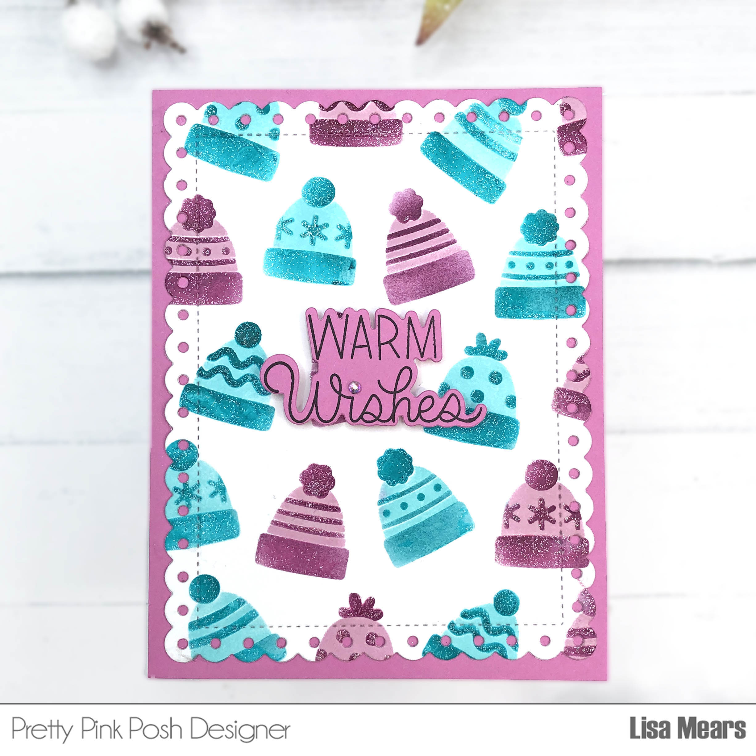 For my second card background, I used the Pretty Pink Posh Layered Winter Hats Stencils. I used the following Catherine Pooler inks: Pink Champagne, Sangria, Cummerbund, and Uptown. I chose two inks in the same color family, one light ink and one dark ink. I added the light ink to the first stencil to define the shape of the hats and then added the darker ink on top to highlight the design of the hat (ie: dots and stripes). After inking the stencils, I added Brutus Montroe Alabaster Glitter Glaze over the second stencil to add some nice sparkle.