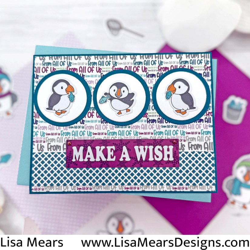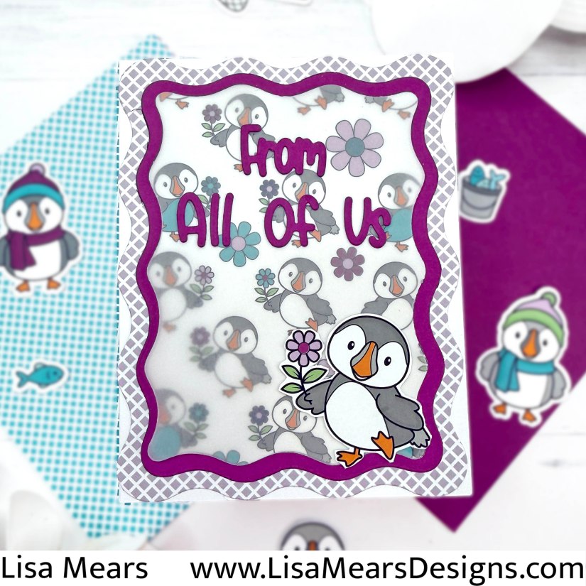 The card kit includes 12 pieces of 8 1/2″ x 11″ cardstock, A2 envelopes, plastic storage envelope, paper pad, puffin stickers, sentiment stickers, snowflakes embellishments, pink sticky gems, “From All Of Us” word die, ribbon, and an A1 Puffin Die Set.